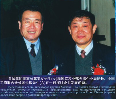皇城集團(tuán)董事長郭寬義先生(左)和國家農(nóng)業(yè)部鄉(xiāng)鎮(zhèn)企業(yè)局局長、中國工商聯(lián)合會長姜永濤先生(右)在一起討論企業(yè)發(fā)展問題