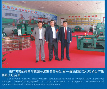 來廠考察的外商與集團(tuán)總經(jīng)理郭亮先生(左一)在光控自動化磚機(jī)生產(chǎn)線展銷大廳合影