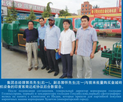 集團(tuán)總經(jīng)理郭亮先生(右一)、副總郭懷先生(左一)與前來批量購買磚機(jī)設(shè)備的印度客商達(dá)成協(xié)議后留影
